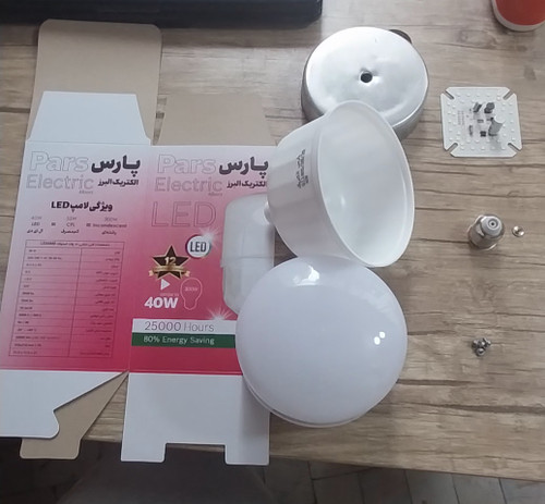 پک کامل لامپ۴۰ وات جهت مونتاژ شامل بدنه وحباب و چیپ و چهاعدد پیچ و جعبه و سرپیچ