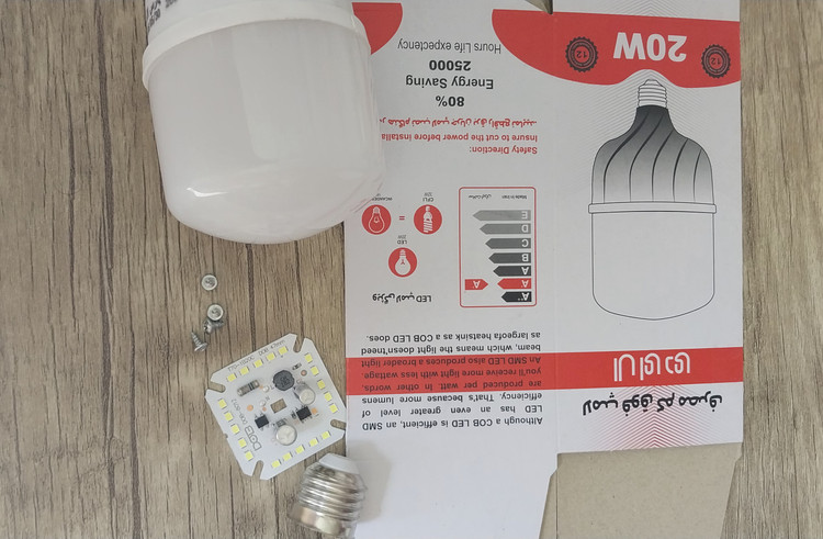 پک کامل لامپ ۲۰ وات جهت مونتاژ شامل بدنه وحباب و چیپ و چهار عدد پیچ و جعبه و سرپیچ