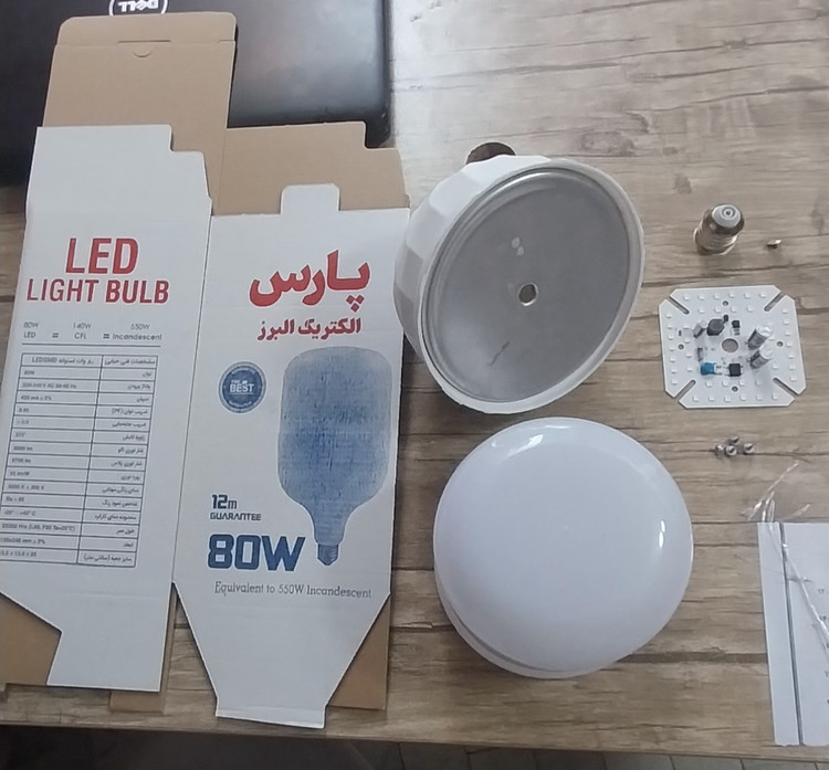 قطعات لامپ ۸۰ وات کامل شامل بدنه وحباب و چیپ و ۴عدد پیچ و جعبه و سرپیچ